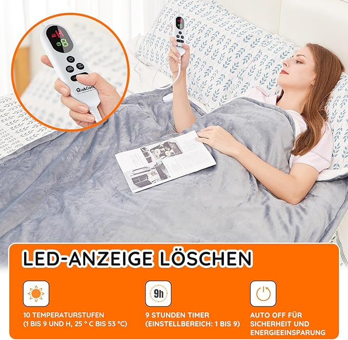 Der Regler ermöglicht die Auswahl von 10 Temperaturstufen, von 25 °C bis 53 °C (Einstellungen 1 bis 9 und H), sowie die Einstellung eines Timers für die automatische Abschaltung. Die Decke ist ETL-zertifiziert, was eine sichere Nutzung gewährleistet, sofern die Bedienungsanleitung befolgt wird.