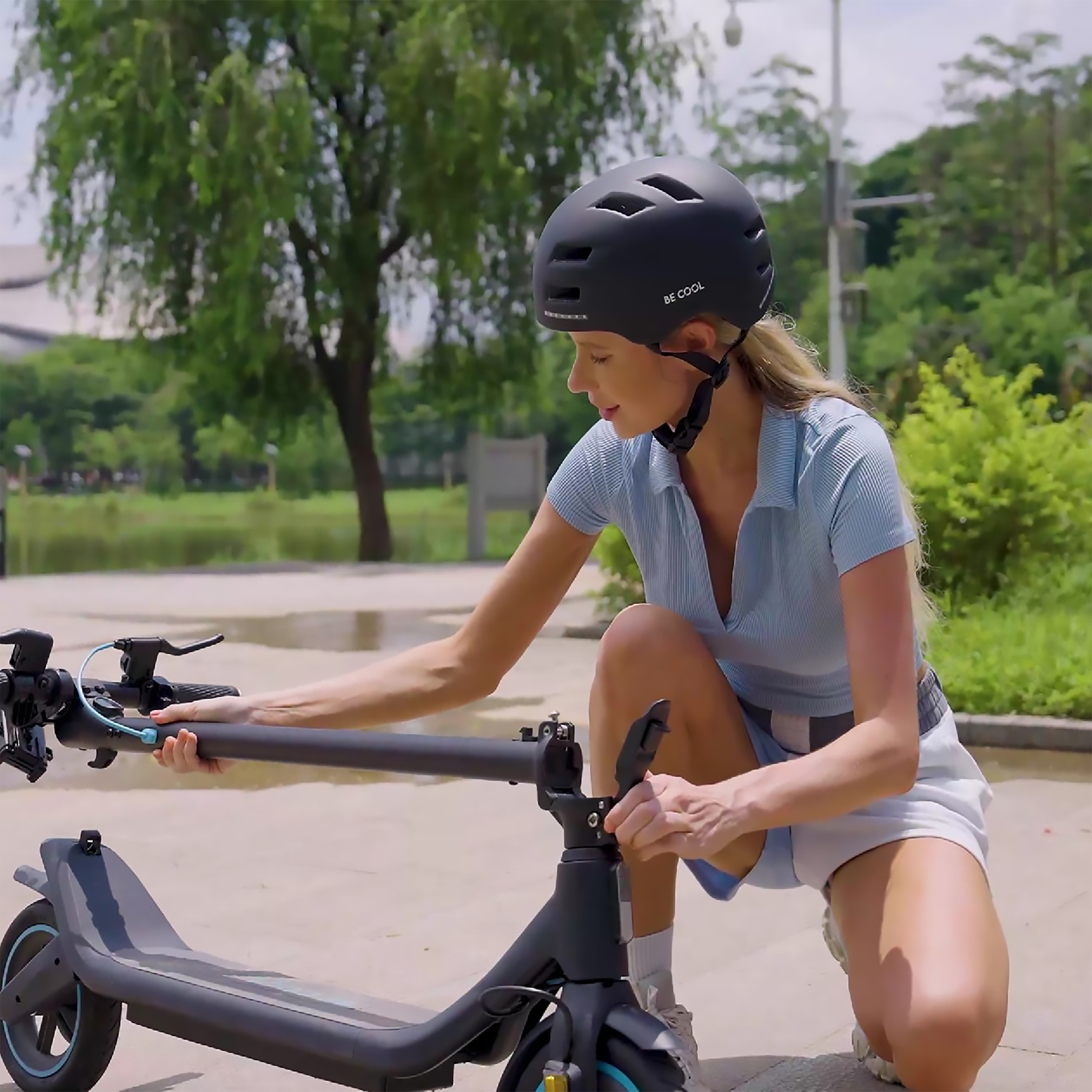 Dank integrierter LED-Beleuchtung vorne und LED-Blinkern hinten wirst du bei jeder Fahrt besser wahrgenommen. Die Blinker lassen sich einfach über die drahtlose Lenker-Fernbedienung steuern und bieten vier Funktionen: Doppelblitz, Linksabbiegen, Rechtsabbiegen und Bremslicht – für eine klare Kommunikation im Straßenverkehr.