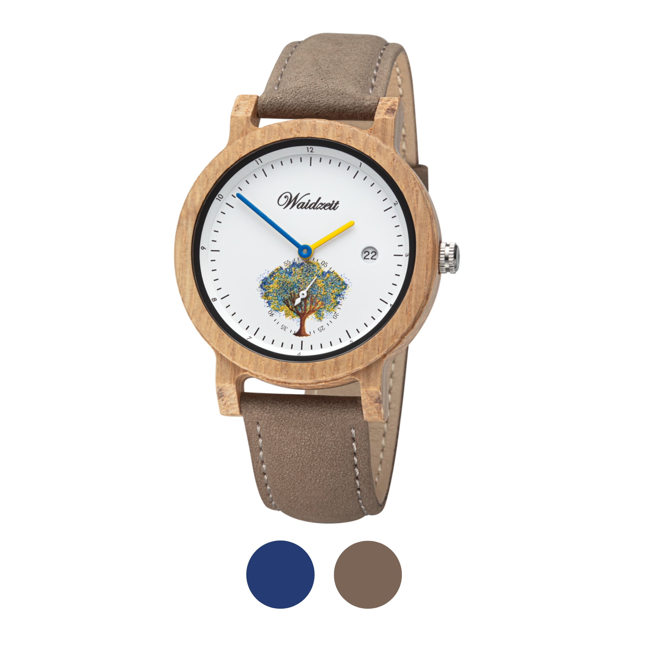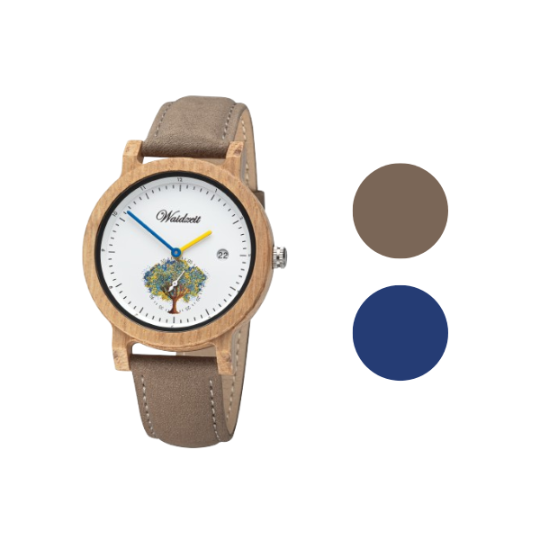 Die Raffinesse dieser klassischen Waidzeit-Uhr zeigt sich in der kleinen Sekunde und dem "Baum des Lebens", entworfen von einer ukrainischen Designerin. Passend dazu erstrahlen die Stunden- und Sekundenzeiger in Blau und Gelb. Darüber hinaus verfügt dieser besondere Zeitmesser aus Holz über eine Datumsanzeige.